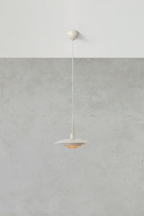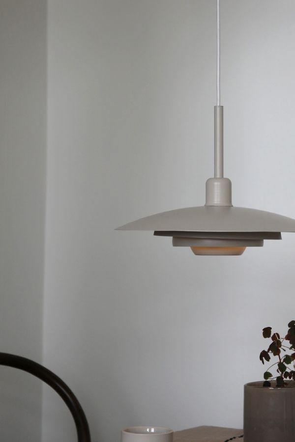 Mindre beige taklampa med skärm och takkopp i beigelackerad metall. Inspirerad av den klassiska hisslampan men med ett modernt och stilrent uttryck. Perfekt som köksbelysning.