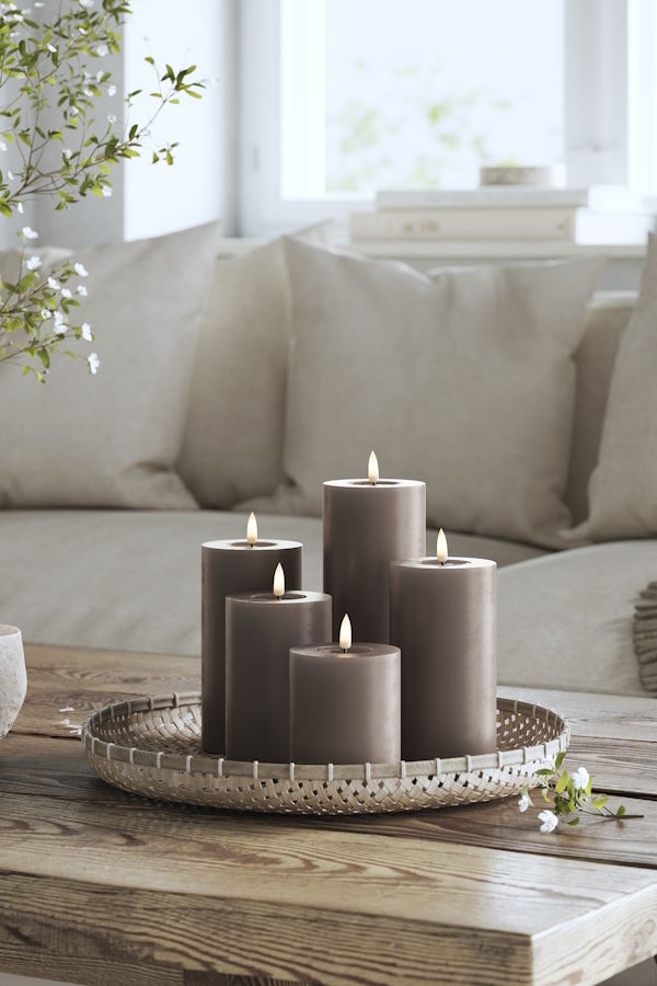 Skapa ett mysigt och inbjudande hem med DeluxeHomearts eleganta bruna LED-blockljus i färgen Mocca. Dess realistiska design med förstärkt topp och WETLOOK™-effekt ger ett mycket verklighetstroget utseende som påminner om äkta stearinljus. Med den patenterade 3D REAL FLAME™-tekniken får du en imponerande naturtrogen ljuslåga som höjer stämningen i varje rum.