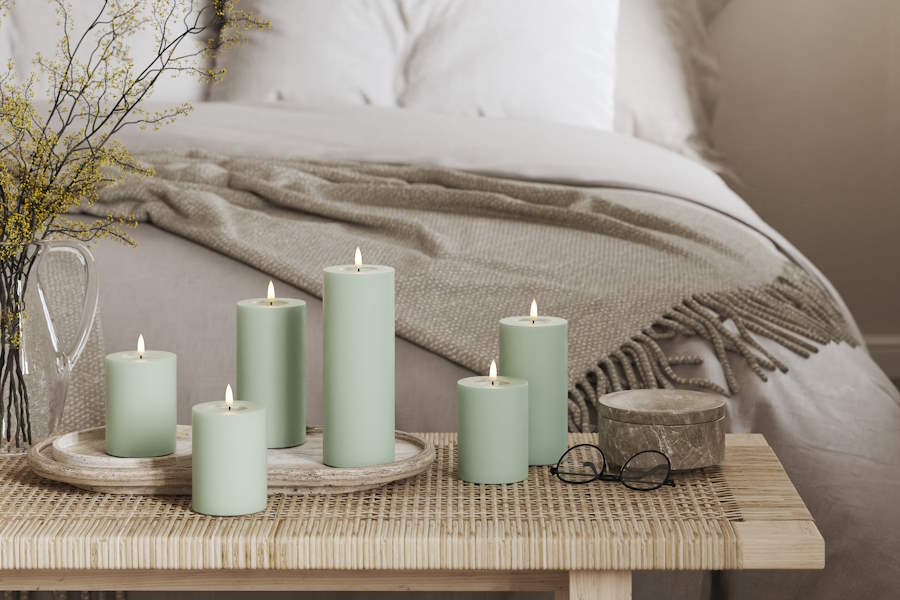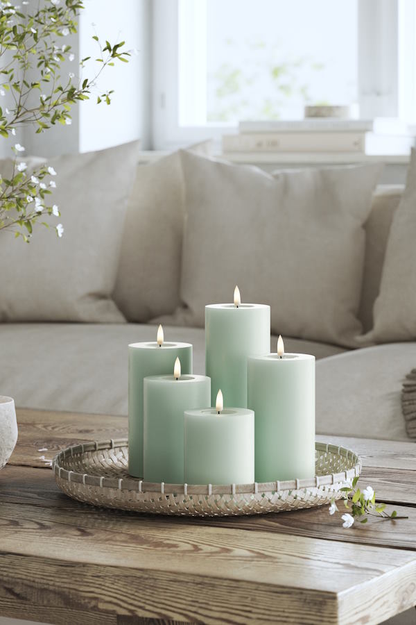 Skapa ett mysigt och inbjudande hem med DeluxeHomearts ljusgröna LED-blockljus i färgen Sage green. Dess realistiska design med förstärkt topp och WETLOOK™-effekt ger ett mycket verklighetstroget utseende som påminner om äkta stearinljus. Med den patenterade 3D REAL FLAME™-tekniken får du en imponerande naturtrogen ljuslåga som höjer stämningen i varje rum.