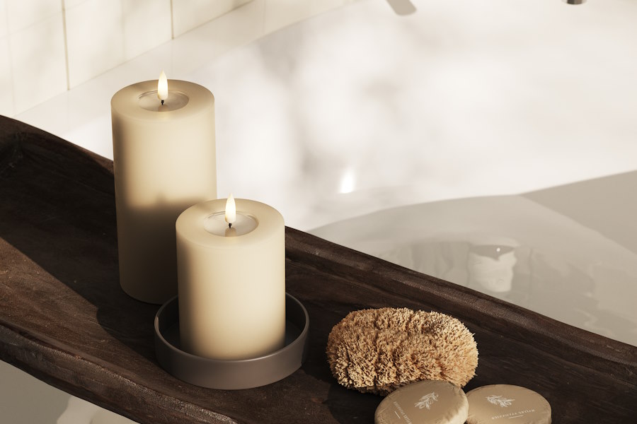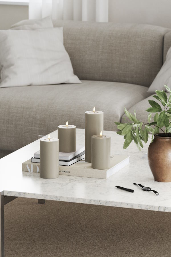 Skapa ett mysigt och inbjudande hem med DeluxeHomearts eleganta beige LED-blockljus i färgen Sand. Dess realistiska design med förstärkt topp och WETLOOK™-effekt ger ett mycket verklighetstroget utseende som påminner om äkta stearinljus. Med den patenterade 3D REAL FLAME™-tekniken får du en imponerande naturtrogen ljuslåga som höjer stämningen i varje rum.