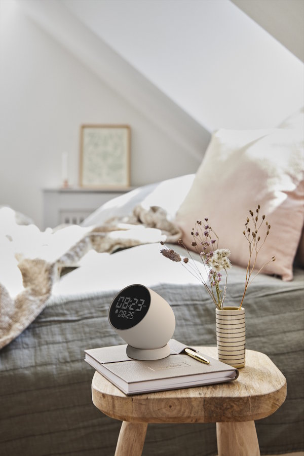 Bell väckarklocka i beige gör dina morgnar både ljusare och enklare. Med sin eleganta och intuitiva design hjälper den dig att vakna med ro och energi. Stäng av alarmet med ett enkelt knapptryck – eller snooza genom att bara vända klockan upp och ner.