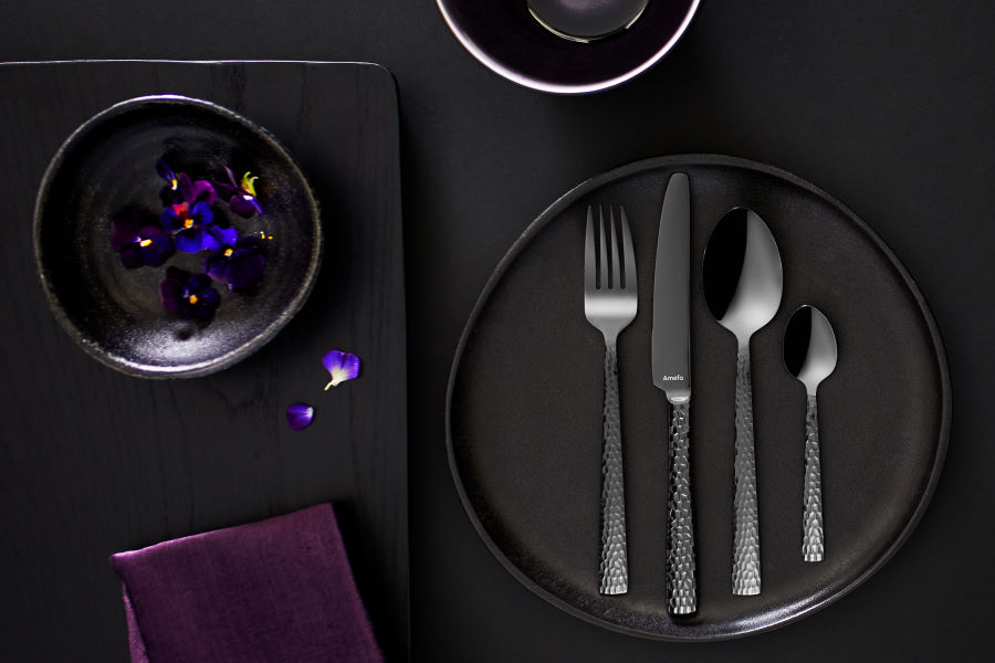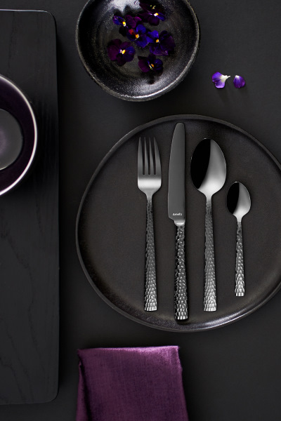 Det svarta hamrade besticksetet Felicity från Amefa förvandlar vardagsdukningen till en spännande och modern dukning på nolltid. Handtagens dekoration ger ett uttryck av samtida hantverk och den högblanka finishen ger en snygg twist till dukningen. Felicity bestick är tillverkade av rostfritt stål 18/0 och tål diskmaskin.