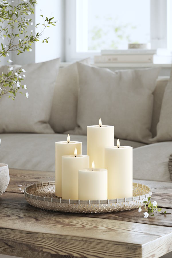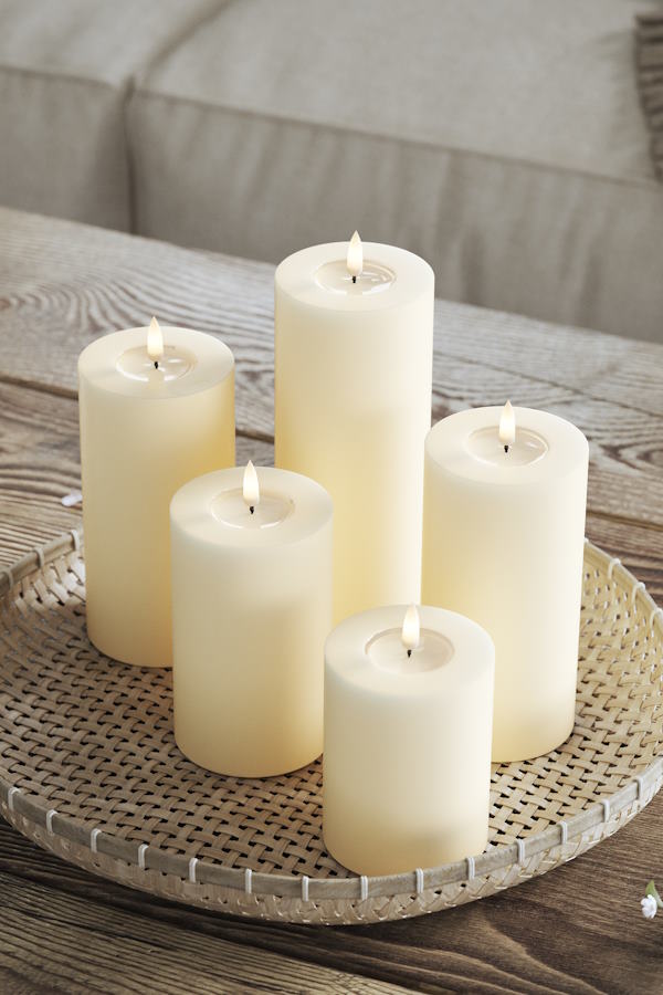 Skapa ett mysigt och inbjudande hem med DeluxeHomearts eleganta krämvita LED-blockljus Cream. Dess realistiska design med förstärkt topp och WETLOOK™-effekt ger ett mycket verklighetstroget utseende som påminner om äkta stearinljus. Med den patenterade 3D REAL FLAME™-tekniken får du en imponerande naturtrogen ljuslåga som höjer stämningen i varje rum.